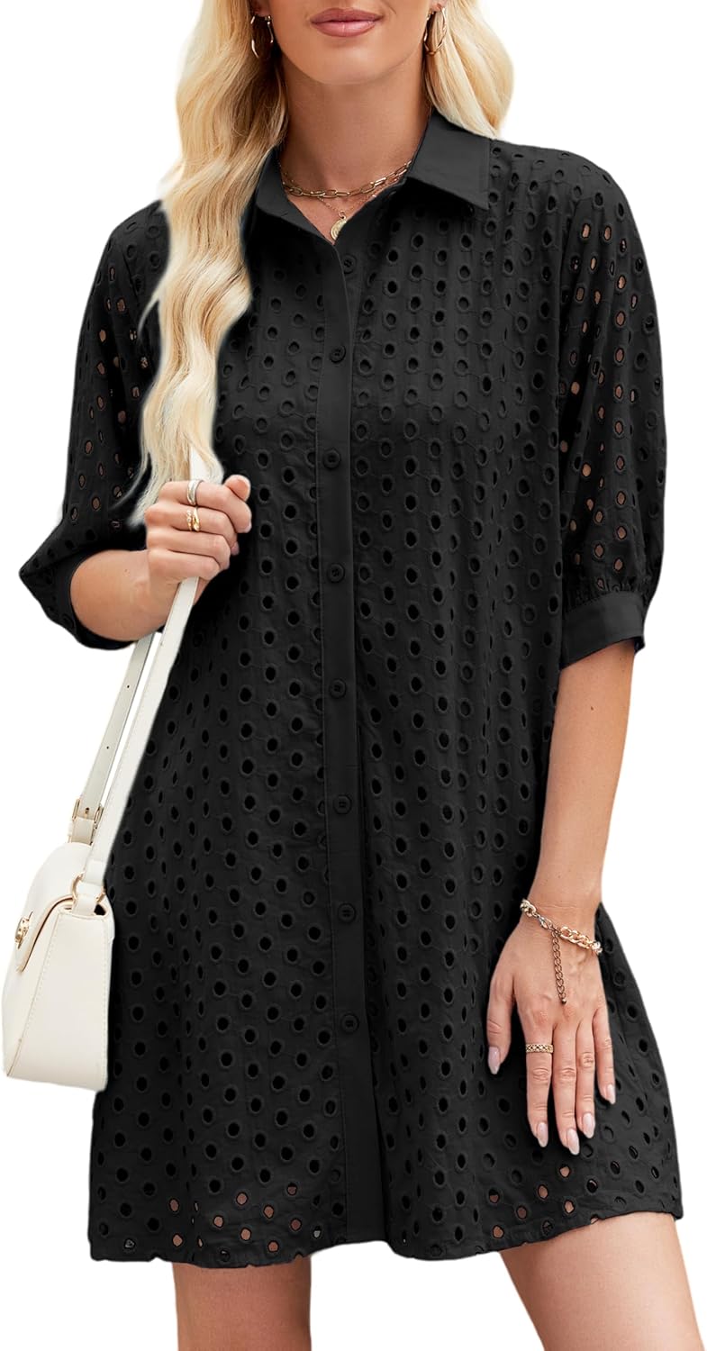 Womens Summer Shirt Dress Eyelet Hollow Out Short Dress with 3/4 Sleeves Button Down Casual Dress Summer Beach Dress